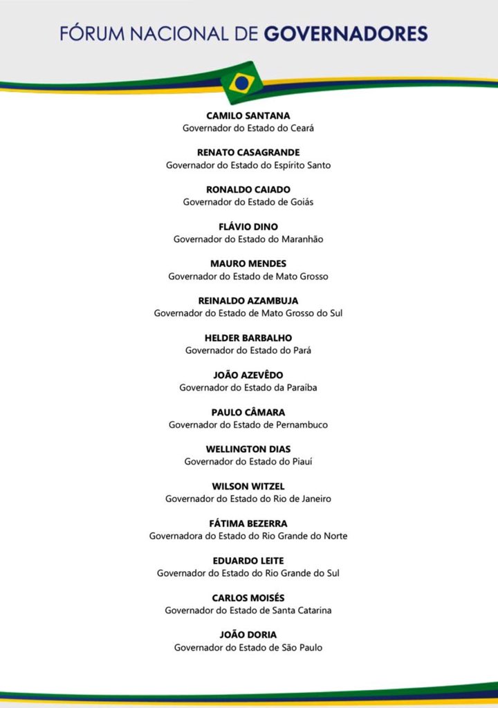 De los 27 gobernadores, 20 divulgaron una carta abierta en defensa de la democracia y en defensa de los presidentes de la Cámara y del Senado en Brasil.