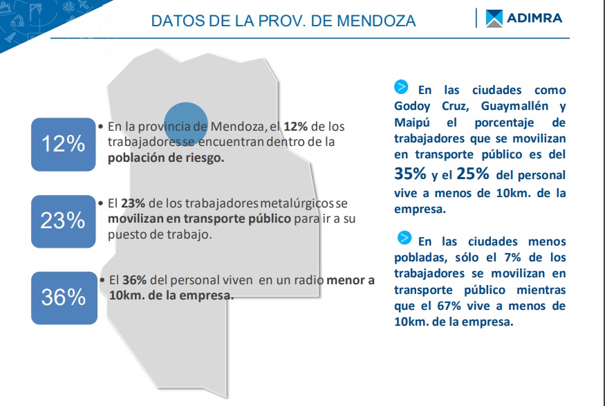 En tanto que, en Mendoza, el 12% de los trabajadores se encuentran dentro de la población de riesgo. Un 23% de los operarios se dirige en transporte público a sus trabajos y un 36% de los mismos se encuentran en radios menores a 10km de la empresa.