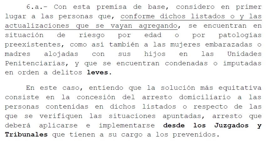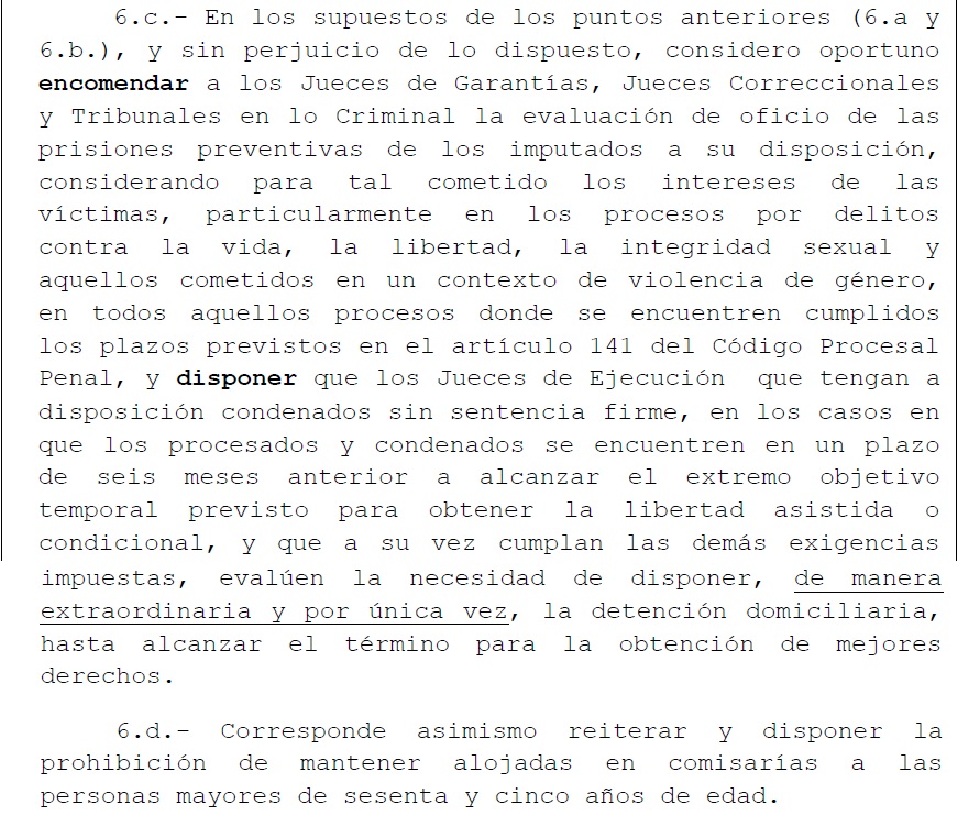En tanto, la CIDH, a través de la Resolución 1/2020 “Pandemia y Derechos Humanos en las Américas” recomienda a los Estados de la región adoptar medidas para enfrentar el hacinamiento de las unidades de privación de la libertad, incluida la reevaluación de los casos de prisión preventiva para identificar aquéllos que pueden ser convertidos en medidas alternativas a la privación de la libertad, dando prioridad a las poblaciones con mayor riesgo de salud frente a un eventual contagio del COVID-19, principalmente las personas mayores y mujeres embarazadas o con hijos lactantes.