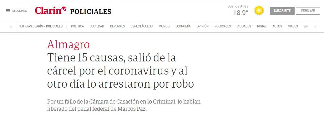 En este fragmento del informe, dejamos dos noticias de las que más se compartieron en redes sociales durante las últimas horas. Una del portal A24.com que se titula “Presos Libres: recién liberado fue a buscar a su ex pareja y la mató, chocó en la huida y murió de un infarto”. Mientras que la otra es de Clarín “Tiene 15 causas, salió de la cárcel por el coronavirus y al otro día lo arrestaron por robo".