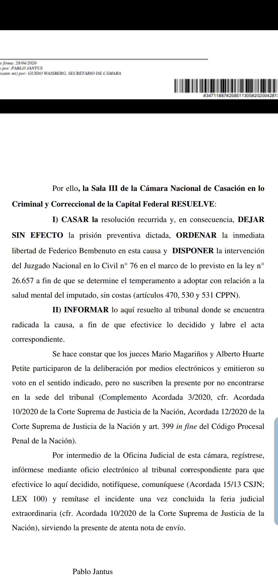 Acá está el fallo donde se decretó la libertad de un delincuente que fue atrapado hoy tras un asalto en Almagro. No tiene que ver con el Covid 19. Se decretó su libertad por su estado de salud mental y se le dio intervención a un juzgado civil. pic.twitter.com/XDXsfljJuU