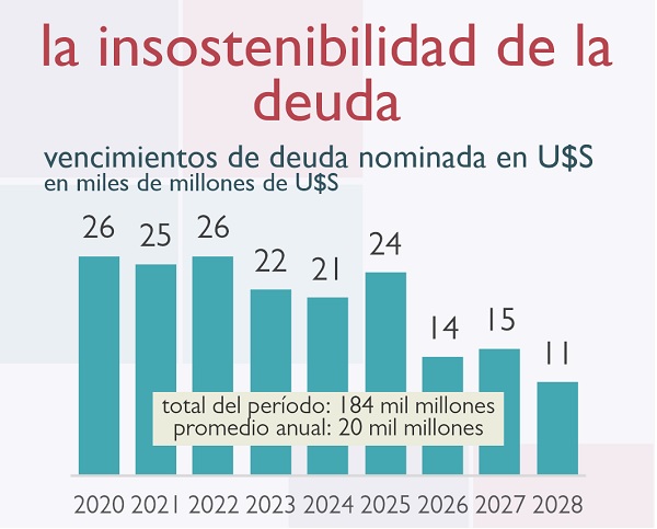 Lo que se plantea fundamentalmente en el informe es la insostenibilidad de la deuda. “Antes de dejar el gobierno, el equipo de Macri elaboró el presupuesto de ingresos y gastos del Estado para el 2020. Allí el problema estaba claro: se estimaban ingresos por 5,2 billones de pesos, al mismo tiempo que debían afrontarse pagos por 4,7 billones. Estaba comprometido el 90% del dinero del Estado”, señala el grupo de economistas.
