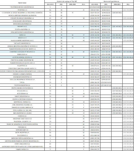 “Siderar aparece en el puesto 36 de fuga con un monto total de U$S 222,9 millones. Tecpetrol, que tiene presencia en Vaca Muerta, aparece fugando U$S 92,6 millones, puesto 86 de fuga durante el macrismo. Transportadora Gas de Norte, en el puesto 33, demandó U$S 231,3 millones”, puntualiza Strada.