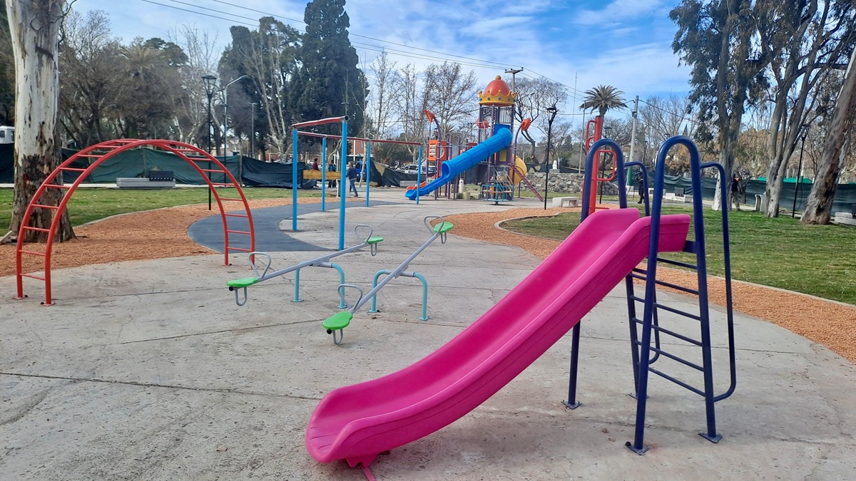 El Parque Infantil cuenta con juegos, dos mangrullos, riego por aspersión, luminarias led, bancos, parquizado, mobiliario urbano y hasta un playón deportivo con césped sintético.